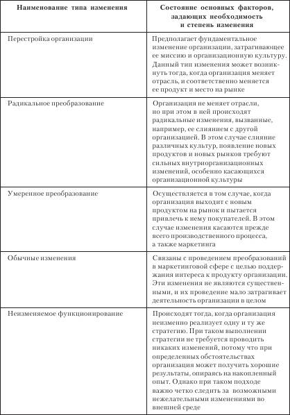 разблокировать существующие установки таким образом, чтобы создать пространство для новых. Для содействия разблокированию может использоваться принуждение. Если суметь сделать так, чтобы работники увидели, что изменение имеет отношение к их собственным нуждам, они, очевидно, стали бы более восприимчивы. Другими словами, их первоначальная позиция может начать изменяться. Изменение. Согласно модели Э. Х. Шейна, изменение установок происходит только при наличии идентификации или интернализации. Если человек может идентифицироваться с другим, у кого есть желаемые установки, это может содействовать желанию измениться. Поэтому для управляющих важно разыскивать лидеров мнений как лиц, производящих изменения. Интернализация – это процесс опробования, адаптации и использования новых установок или методов. Если взгляды или вера человека начинают растворяться, этот человек может захотеть, наконец, обдумать новый подход. Если этот подход докажет свою продуктивность и желательность, то изменение начинает интернализовываться и принимается. Важно, чтобы пробы во время периода интернализации были достаточно хорошими и точными. Заблокирование. Заблокирование – это слово использовано здесь для обозначения окончательного принятия и интеграции желаемых установок таким образом, что нововведение становится постоянной частью личности человека или процедур деятельности. На этом этапе необходимы время и поддержка. Немедленно и постоянно вознаграждаемое поведение, по-видимому, должно становиться частью обычного поведения человека. Стили проведения изменений. Эффективная адаптивность предполагает проведение постоянных изменений, обеспечивающих устойчивое развитие организаций в условиях нестабильной среды. Изменения в организации могут происходить на уровнях: индивидуальном, групповом (коллективном) и на уровне организации в целом. Причины, вызывающие изменения, могут быть самые разные; в общем виде их можно классифицировать на внутренние и внешние. Внешние обусловлены изменениями в законодательстве, рыночной ситуацией и т. д., внутренние – недостаточной квалификацией персонала, низкой производительностью труда, несовершенными технологиями и т. д. Организационные изменения охватывают как процессы функционирования, не нарушающие динамического равновесия (т. е. процессы, развертывающиеся в рамках данной структуры), так и процессы развития, нарушающие это равновесие. Организационные изменения могут охватывать все подсистемы и параметры организации: продукты, технологию, оборудование, разделение труда, организационную структуру, методы управления, процесс управления, а также все поведенческие аспекты организации. Следует заметить, что все они тесно связаны между собой и изменения в одной из них влекут хотя бы частичные изменения в других сферах и окажут влияние на организацию в целом. Решающую роль в инициировании и осуществлении изменений играют руководители, т. к. они несут ответственность за разработку стратегии изменений и планирование мероприятий по их осуществлению. Поэтому очень важное значение имеет выбранный стиль проведения изменений в организации (см. табл. 9.2.2). Управление проведением изменений. Управление проведением изменений должно опираться на определенные принципы. Их общая направленность состоит