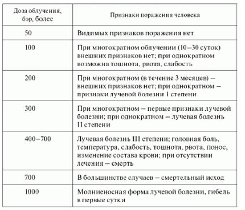 Таблица 9 Признаки поражения человека в зависимости от дозы облучения