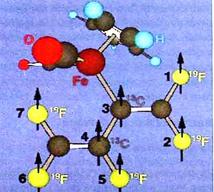 В качестве квантовых ячеек можно использовать атомы со спином, равным 1/2, связанные в пределах одной молекулы. Идея была предложена в 1997 году и в том же году реализована на двухкубитовой системе атомов водорода в молекуле 2,3-дибромотиофена и трехкубитовой системе в молекуле трихлорэтилена (1 атом водорода и 2 атома изотопно чистого 13С). В 2001 г. была создана система, состоящая из 7 кубитов, на основе молекулы (пентафторбутадиен-2-ил) циклопентадиенилдикарбонила железа (5 атомов фтора и 2 атома 13С, рис. 8), и впервые реализован алгоритм Шора - число 15 было разложено на простые множители 5 и 3. В отличие от