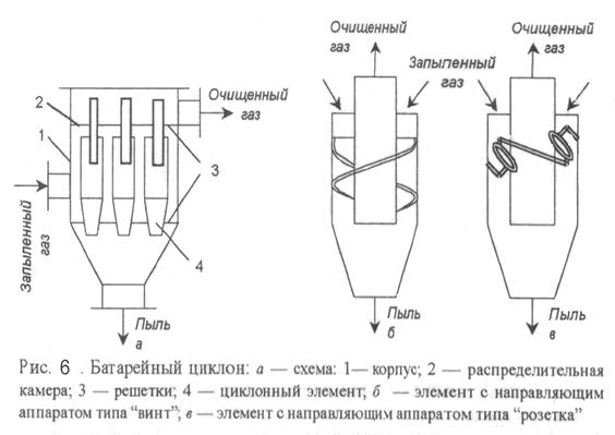 -одиночные; - групповые (рис.6)- используют при больших расходах очищаемых газов; - батарейные (объединение мультициклонов с диаметром 100-250 мм в группу).