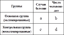Таблица 5. Макет таблицы «два на два» для статистической обработки результатов проспективных когортных исследований, с использованием показателя «человек время». где: a – число заболевших в основной группе; c число заболевших в контрольной группе; b – число человеко-лет наблюдения (ЧЧЛ) в основной группе d – число человеко-лет наблюдения (ЧЧЛ) в контрольной группе По данным таблицы рассчитываются: 1. абсолютный риск в показателях человек время для основной (PtRF+) и контрольной (PtRF--) группы: