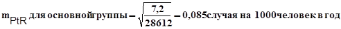 4. достоверность различий абсолютного риска в сравниваемых группах (PtRF+ и PtRF-). Его значение определяется с помощью критерия t, или сравнением доверительных границ, или другим соответствующим методом. Стандартная ошибка (m) показателя человек время рассчитывается по формуле: