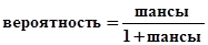Так, в предыдущем примере: вероятность = 2/(1+2)=0,67 или 67,0% В некоторых случаях шансы удобнее использовать, чем вероятности.