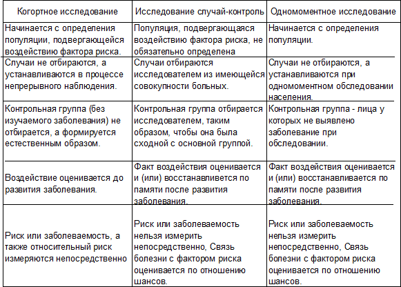 Таблица 10. Основные характеристики когортного исследования, исследования случай-контроль и одномоментного исследования. Источник. Клиническая эпидемиология. Р. Флетчер с соавт., Медиа Сфера, Москва 1998.