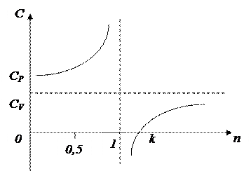 1. При n=0, теплоемкость соответствует изобарному процессу С = Ср; 1>n>0: С>0, dq>0, U>0; 2. При n=1 С стремится к бесконечности; 3. При k>n>l С - имеет отрицательные значения; 4. При n=k C=0 5. При 6. При n=