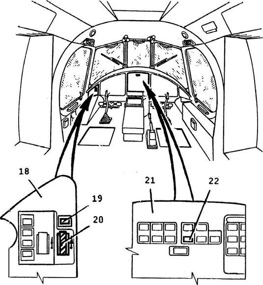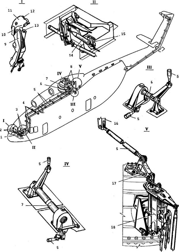 1. Вал колонки продольно-поперечного управления 2. Ручки управления 3. Механизмы загрузки (триммеры) 4. Кронштейны с качалками 5. Тяги 6. Вал с качалками продольного управления 7. Вал с качалками поперечного управления 8. Комбинированные агрегаты (гидроусилители) продольного и 9. Рычаг торможения колес шасси 10. Гашетка СВЯЗЬ-РАДИО 11. Рукоятка 12. Кнопка выключения автопилота 13. Кнопка выключения электромагнитных тормозов механизмов 14. Пружинный механизм загрузки 15. Электромагнитный тормоз механизма загрузки 16. Качалка автомата перекоса 17. Качалка 18. Комбинированный агрегат (гидроусилитель) продольного Продольно-поперечное управление (спецификация к рисунку)