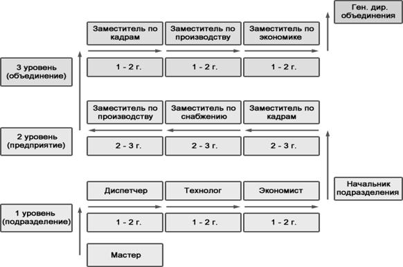 Реализация на практике модели карьеры «лестница» психологически затруднена из-за нежелания руководителей уходить с «первых ролей», поэтому она должна поддерживаться вышестоящим органом управления, например, советом директоров, правлением. Модель карьеры «змея» предусматривает горизонтальное перемещение работника с пребыванием в одной должности 1-2 года на другую. После изучения конкретных функций управления на данном уровне управления работник переводится на вышестоящую должность (рис. 56).