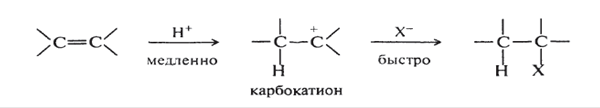 Правило Марковникова: при взаимодействии реагентов типа НХ с несимметричными алкенами водород присоединяется к атому углерода, связанному с максимальным числом атомов водорода, т.е. к наиболее гидрогенизированному атому углерода двойной связи