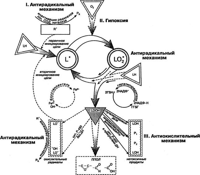 Рис. VI.11. Схема механизмов защиты клетки от образования и токсического действия ОРТ. Обозначения: LH — восстановленные молекулы липида, L· — радикал липида, LO — алкоксил-радикал, LO-2 — пероксил-радикал, ДН — донор водорода, HIn — восстановленный ингибитор, ГSН — восстановленный глутатион, ГГSГ — окисленный глутатион, R· — молекула в свободнорадикальном состоянии