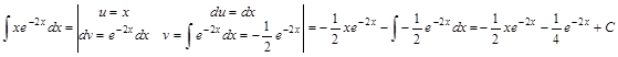 a,m,k – действительные числа ( Для нахождения интегралов из первой группы формулу интегрирования по частям придется применить n раз, пока степень n переменной x не станет равной нулю. При этом принимают Для нахождения интегралов второй группы полагают Замечание. Константа C, полученная при вычислении v в запись окончательного ответа не входит. Поэтому при подстановке ее в формулу (6) будем принимать C=0, что упростит запись решения. На практике метод интегрирования по частям часто комбинируется с другими методами интегрирования. Пример 1. Найти интеграл: Решение: Решение: