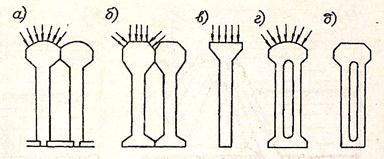 Контрфорси бувають суцільними (одиночними) – а), б), в) і пустотілими (парними або здвоєними) – г), д).