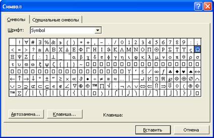 Створення елементу списку “Автозамена”. Для створення елементу списку “Авто- замена” необхідно скористатися послідовністю дій: меню Вставка — команда Символ — вибрати потрібний символ — кнопка “Автоза- мена” — діалогове вікно “Автозамена” — вкладка “Автозамена” — поставити прапорець “Заменять при вводе” — внести відповідні значення в текстові поля “Заменить” та “На” — кнопка “Добавить”. Наприклад, малюнку призначили комбінацію ”!T!” (рис. 2.15.)