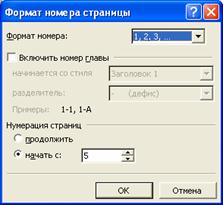 Кнопкою “Формат” викликається діалогове вікно “Формат номера страницы” (рис. 2.44.) за допомогою якого можна задати тип нумерації (цифри, літери та ін.) та визна- чити з якого числа почати нумерацію. На рис. 2.44. вибрано тип нумерації — арабські ци- фри, номер з якого починати нумерацію — 5.