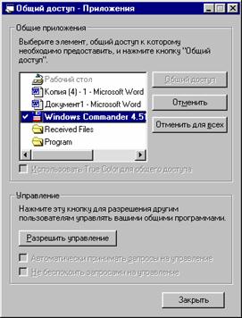 Як уже зазначалося, ви можете не тільки показувати іншим учасникам зустрічі, що відбувається на вашому комп'ютері, а й дозволити їм управляти його роботою. Для цього вам треба натиснути кнопку Разрешить управление (рис. 7.16.). Тоді в назві вікна вашого робочого столу, що відображається на їхніх комп'ютерах з'явиться слово Управляемое і в меню Управление цього вікна стане доступною опція Запросить управление. Якщо інший учасник зустрічі вибере цю опцію або просто двічі клацне мишкою по вікну, в якому відо- бражається ваш робочий стіл, то до вас надійде запит на управління вашим комп'ютером, який ви зможете прийняти або відхилити.