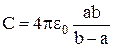 Ємність сферичного конденсатора. Нехай радіуси внутрішньої і зовнішньої обкладок конденсатора дорівнюють відповідно a і b. Якщо заряд конденсатора q, то напруженість поля між обкладками визначається за теоремою Гаусса:
