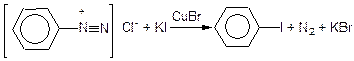 б) при нагріванні хлористої, бромистої або йодистої солі діазонію з відповідною сіллю (KCl, KBr, KI) за наявністю каталізатору – солі міді (І), також виділяється азот: