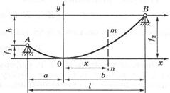 У техніці і будівництві (канатні дороги, висячі мости, електричні мережі, ланцюгові і пасові передачі, різні троси) трапляється ще один вид розтягнутих конструкцій — гнучкі нитки. Вони працюють тільки на розтяг і не чинять опору іншим видам деформації (рис. 4). Нехай ця гнучка нитка навантажена власною вагою і закріплена у двох точках на різних рівнях. Рис. 4 Горизонтальну проекцію Вважаємо, що вага рівномірно розподілена по довжині його проекції на горизонтальну вісь. Нехай інтенсивність q рівномірно розподілена по прогину. Це навантаження (сила — довжина) може бути не тільки власною вагою, а й вагою льоду, тиску вітру та ін. Початок координат візьмемо у найнижчій точці провисання. Виріжемо частину проводу x двома перерізами (рис. 5). Сили