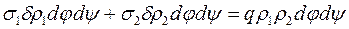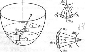 Отже, згин оболонки відсутній. Теорію оболонок, побудовану на цих припущеннях, називають безмоментною, або мембранною. Нехай посудина, яка має форму тіла обертання з віссю Зі стінки оболонки виділимо нескінченно малий елемент двома площинами вздовж меридіанів і вздовж паралелей. Через те що тиск і оболонки симетричні, по площинах виділеного елемента не буде дотичних напружень, тобто вони будуть головними, по яких діятимуть головні напруження Склавши рівняння рівноваги (суми проекцій усіх прикладених сил на нормаль до поверхні), одержимо