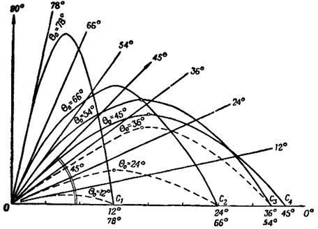Из данных таблицы следует, что сопряженными траекториями являются траектории, получаемые при углах бросания 12 и 78°, 24 и 66°, 36 и 54°. Таким образом, одну и ту же цель, находящуюся в пределах досягаемости орудия, можно поразить при двух углах бросания, один из которых меньше, а другой больше 45°.