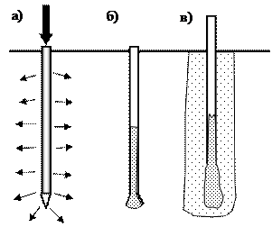 З поверхні грунту в ущільнюваної підстава занурюється труба, на кінці якої розміщений гідровібратор. У трубу подається необхідна кількість води, до досягнення ущільнюються підставою оптимальної вологості. Труба разом з гідровібратором підвішується до стріли крана і під дією власної ваги занурюється в ущільнюваної основу. У ре-док процесу занурення і витягу гідровібратора грунт уп-лотняется в обсязі циліндра діаметром 1,5... 2 м і висотою до 10 м, і є підстави переходить в категорію середньої щільності. У разі необхідності для досягнення підставою підвищеної щільності, даний метод може поєднуватися з поверхневим ущільненням. б) метод ущільнення піщаними та грунтовими палями (рис. 6).