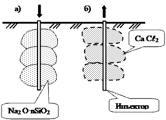 2.2. Силікатизація підстав Силікатизація - це хімічне закріплення грунтів з Кф = 2…80 м/добу при нагнітанні в основу розчину кремінної кислоти (рідкого скла) Na2 O·nSiO2. При розкладанні в грунті кремінна кислота переходить у стан гелю і пов'язує окремі мінерали. Для прискореного ренію даного хімічного процесу в грунт вводять каталізатор - хлор-Стий кальцій (Са Сl2). Такий спосіб закріплення грунтів отримав назву двухрастворного (рис. 10).