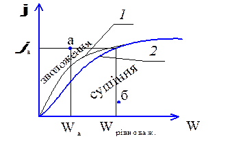 В точці а Wa<Wрівнов. φа>φрівн. Відповідно для досягнення рівноваги вологість матеріалу буже зростати, тобто точки над кривою рівноваги відповідають умовам зволоження, під кривою − сушінню.
