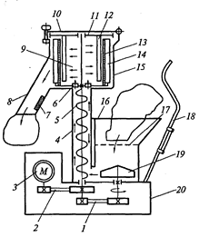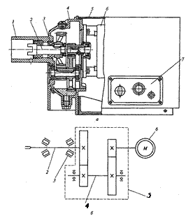 Рис. 16. Привід універсальної кухонної машини: а – загальний вигляд; б – кінематична схема; 1 – горловина; 2 – робочий вал; 3 – конічні роликопідшипники; 4 – редуктор; 5 – кожух; 6 – електродвигун; 7 – пульт управління