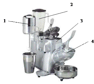 Рис. 17. Барний комбайн 1 – міксер; 2 – блендер; 3 – соковижималка для цитрусових; 4 – подрібнювач льоду Сортувально-калібрувальне устаткування призначене для сортування (розділення за якістю), калібрування (розділення за величиною часточок) харчової сировини і просіювання (відділення сторонніх домішок) сипких продуктів. Для сортування і калібрування (здебільшого рослинної сировини) використовуються пристрої, які за конструктивними особливостями можна поділити на стрічкові, вібраційні, барабанні, дискові, конусні. Стрічкові пристрої обладнані конвеєрною стрічкою, яка рухається зі швидкістю 0,05…1,0 м/с вздовж робочих місць для обслуговуючого персоналу (шириною 0,8…1,2 м) зі збірниками для видалення некондиційної продукції. Основним робочим органом просіювальних машин (рис. 17) є сита, виготовлені із металевих плетених сіток (рідше капронових чи шовкових) чи перфорованої тонколистової сталі з отворами круглої, овальної чи прямокутної форми.