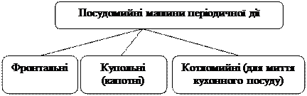 Малогабаритні посудомийні машини з фронтальним завантаженням передбачені для невеликих закладів харчування і встановлюються на столі, на спеціальній підставці чи під столом. Машини купольного типу призначені для використання в закладах ресторанного господарства середньої місткості. Гідравлічна схема посудомийної машини періодичної дії наведена на рис. 18