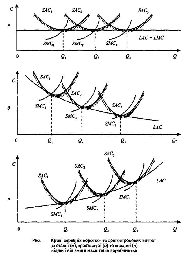 На динаміку витрат у довгостроковому періоді найбільше впливає характер ефекту від зростання масштабів виробництва. Варіанти кривих середніх витрат виробництва підприємства у довгостроковому періоді наведено на рисунках. За умови зростаючого ефекту від масштабу виробництва фірмі слід збільшувати обсяги виробництва продукції доти, поки потенційні можливості економії на масштабах не будуть вичерпані. У деяких випадках у підприємства виникають витрати, які воно не в змозі собі відшкодував, якщо, приміром, припинить свою діяльність та вийде з даної галузі. В такому разі говорять про незворотні витрати, альтернативна вартість яких дорівнює нулю.