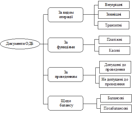 Платіжні документи, з якими працює ОДБ, можна розподілити на внутрішні, зовнішні та транзитні. Внутрішні документи — це документи, проведення по яких виконується по особових рахунках банку. Зовнішні — це міжбанківські документи, проведення по яких виконується між кореспондентськими рахунками та особовими рахунками банку. Зовнішні документи, в свою чергу, ще поділяються на початкові та зворотні. Початкові документи — це документи, сформовані в банку для відправлення в СЕП. Зворотні — це документи, що надійшли з СЕП у банк. Транзитні — це документи, по яких не виконуються проведення. За ознакою проведення по рахунках документи розподіляються на: проведені по рахунках та не допущені до проведення з різних причин. Не допущені до проведення, в свою чергу, діляться на документи, які резервують кошти на рахунку для майбутнього проведення, та на документи, які не резервують кошти. Документи, які резервують кошти, зберігаються в картотеках № 2, № 3 та картотеці планових платежів. Документи, які не резервують кошти, зберігаються в картотеці нез’ясованих сум та картотеці № 1. Картотека № 1 — це картотека попереднього акцепта. До неї заносяться документи за бажанням клієнта. В картотеку № 2 заносять документи при недостатності коштів на особовому рахунку під час проведення. Картотека № 3 вміщує документи, які були відкладені з причини фінансового контролю. Щодо балансу документи поділяються на балансові та позабалансові. Загальну класифікацію документів ОДБ наведено на рис. 3.1.