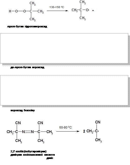 В якості ініціаторів можуть виступати гідрогенпероксиди, пероксиди алкілів, ацилів, азо- та діазосполуки.