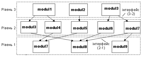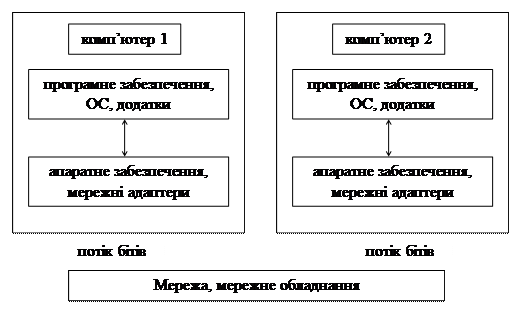 Рис. 1. Взаємодія двох комп’ютерів Це є абстрактна модель, яка узагальнено відображає організацію роботи в мережі. Справжня модель є значно складнішою. Загальне завдання розділяється на кілька модулів, чітко визначаються функції для кожного модуля, який вирішує певну задачу, а також інтерфейси між модулями, які забезпечують їх взаємодію. Для створення стрункої моделі використовують багаторівневий підхід, де передбачено вищі та нижчі рівні. Всю множину модулів розподіляють на рівні чітко за функціональними обов'язками. Модулі верхніх рівнів для виконання своїх завдань звертаються із запитами тільки до модулів безпосередньо ближніх нижніх рівнів. Результати виконання роботи модулів нижніх рівнів передаються, навпаки, до модулів сусідніх верхніх рівнів. Набір функцій, які притаманні взаємодії двох сусідніх рівнів визначають відповідні інтерфейси (рис. 2). Набори функцій для всіх рівнів та інтерфейсів між рівнями є чітко визначеними і відносно незалежними. Саме тому, такі моделі мають важливу перевагу ‑ заміна того чи іншого модуля мало відбивається на загальному функціонуванні моделі в цілому. Модулі нижнього рівня вирішують задачу передавання сигналів між двома сусідніми вузлами. Модулі середнього рівня можуть організовувати транспортування повідомлень в межах всієї мережі, користуючись засобами нижнього рівня. Модулі верхніх рівнів надають користувачам доступ до різних служб, ‑ файлових, друку тощо.