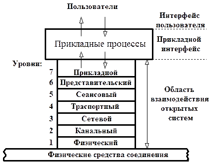 Рис. 2. Багаторівнева структура Такий багаторівневий підхід до реалізації функцій системи застосовується не лише відносно мережних засобів. Наприклад, за такою же моделлю працюють локальні файлові системи. Нехай, користувачу потрібно відкрити певний файл. Верхній рівень моделі розбирає «по кісточках» складене символьне ім'я цього файлу і визначає його унікальний ідентифікатор. Наступний рівень за цим ідентифікатором з’ясовує всі основні характеристики файлу: адресу знаходження, атрибути доступу тощо. На нижчому рівні перевіряються права доступу до файлу, і після обчислення координат області файлу, що містить необхідні дані, виконується фізичний обмін із зовнішнім пристроєм за допомогою драйвера диску. В мережній взаємодії в процесі беруть участь два комп’ютери, тому тут потрібно змоделювати узгоджену роботу двох «ієрархій». Завдання ускладнюється багатьма узгодженостями між цими вузлами. Це угоди про рівень і форму електричних сигналів, спосіб визначення довжини інформації, методи контролю її на помилки і достовірність. Правила повинні бути застосовані для всіх рівнів, починаючи від найвищого, що реалізовує сервіс користувача мережі – до найнижчого рівня, що керує передачею бітів інформації. Можна організовувати багато моделей, але потрібна єдина, стандартна модель, якої б дотримувалися всі виробники мережних продуктів, щоб, як мінімум, забезпечити сумісність нових розробок та розробок, що вже існують і працюють в комп'ютерних мережах. Така модель була створена на початку 80-х років фахівцями провідних організацій зі стандартизації і була розроблена на підставі великого досвіду, отриманого при створенні комп'ютерних мереж, в основному глобальних. Вона зіграла значну роль в розвитку мереж і дотепер все, що стосується мережної взаємодії, прямо або побічно використовує цю модель. 2. OSI ‑ Базова Еталонна модель взаємодії відкритих систем Еталонну модель OSI (Open System Interconnection Reference Model), розроблено Міжнародною організацією зі стандартизації (International Organization for Standardization, ISO). В широкому сенсі відкритою системою може бути названа будь-яка система (комп'ютер, обчислювальна мережа, ОС, програмний пакет, інші апаратні чи програмні продукти), яка побудована відповідно до відкритих специфікацій. Під терміном «специфікація» в обчислювальній техніці розуміють опис апаратних або програмних компонентів: способи їх функціонування, взаємодія з іншими компонентами, умови експлуатації, обмеження і особливі характеристики. Під відкритими специфікаціями розуміють опубліковані, загальнодоступні специфікації, що відповідають стандартам і є прийнятими в результаті досягнення згоди після всебічного обговорення всіма зацікавленими сторонами. Для реальних систем повна відкритість є недосяжним ідеалом, «відкритими» є лише деякі частини, що підтримують зовнішні інтерфейси. Наприклад, відкритість сімейства операційних систем Unix полягає у наявності стандартизованого програмного інтерфейсу між ядром і застосуваннями, що дозволяє легко переносити застосування з середовища однієї версії Unix в середовище іншої версії. Чим більше відкритих специфікацій використано при розробці системи, тим більш відкритою вона є. В моделі OSI під відкритою системою розуміють мережний пристрій, що може взаємодіяти з іншими мережними пристроями з викорис