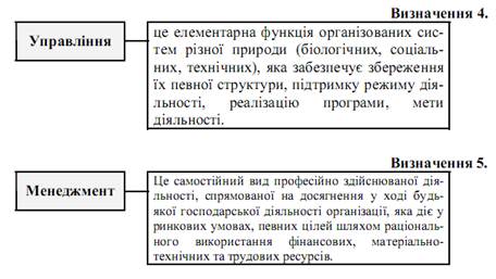 Термін «менеджмент» вживається у багатьох значеннях і часто використовується як синонім терміну “управління”. Дослідниками основних підходів до науки управління наведено множину дефініцій понять “менеджмент” і “управління” – від розуміння менеджменту як складової управління, до ототожнення цих понять.
