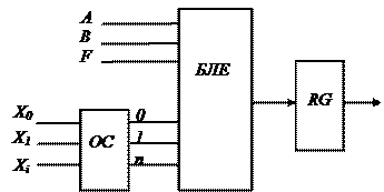 До складу ОА універсальних комп'ютерів входять: · блок логічних елементів (БЛЕ), що виконує логічні операції І, АБО, Виключальне АБО та інш.; · дешифратор команд (DK); операнди (А, B, F); · код операції (Х0, Х1, Х2,Хі); · вихідний регістр (RG). Простий приклад реалізації однорозрядного АЛП на логічних елементах для виконання операцій, кон'юнкції (A^B), диз'юнкції (AVB) і виключального АБО (A