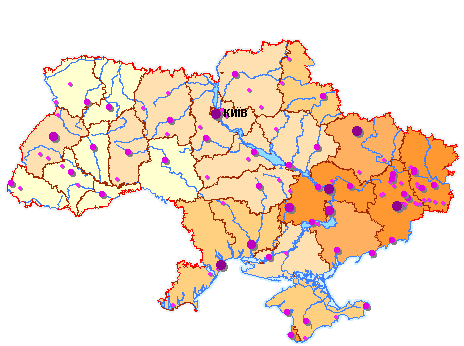 Низький ступінь урбанізації (менше 50%) притаманний населенню Вінницької, Рівненської, Тернопільської, Івано-Франківської, Чернівецької та Закарпатської областей (в останній питома вага міського населення не сягає і 40%), тоді як за переписом 1959 року міське населення переважало лише в Криму та п'яти індустріальних регіонах сходу України. За період між першим та останнім повоєнними перписами населення збільшення чисельності городян відбулося в усіх регіонах України: в Донбасі – на 13–19%, на Дніпропетровщині та Харківщині – у 1,5 рази, в більшості регіонів – в 1,7–2,4 рази, на Тернопільщині – в 2,7, Рівненщині – в 3,5 рази. Збільшення кількості сільських мешканців за цей період зафіксовано лише в Криму (на 78,2% – перш за все за рахунок значного міграційного притоку) та на Закарпатті (на 20,9% – внаслідок високого природного приросту). За станом на 5.12.2001 р. в Україні нараховувалося 4541 міста, 889 селищ міського типу та 286192 сільських населених пунктів, об'єднаних у 10272 сільради. За даними перепису 46 міст держави належать до великих, тобто мають чисельність населення 100 тис. осіб і більше, у 56 містах кількість мешканців становить від 50 до 100 тис. осіб. У великих містах проживає 38,3% всього або 56,9% міського населення. Половина великих міст держави зосереджена в східних індустріальних регіонах (7 – у Донецькій області, 5 – у Дніпропетровській, 4 – в Луганській, 3 – в Запорізькій) і в Криму (3 – в складі АР Крим, а також м.Севастополь). В Україні нараховується 5 міст-мільйонерів – Київ (2611 тис. осіб), Харків (1470 тис.), Дніпропетровськ (1065 тис.), Одеса (1029 тис.) та Донецьк (1016 тис.) і ще 4 крупних міста – Запоріжжя (815 тис.), Львів (733 тис.), Кривий Ріг (669 тис.) та Миколаїв (514 тис. осіб). Регіональні особливості формування мережі сільських поселень перебувають у певній відповідності з територіальною диференціацією природних умов (на міське розселення вони впливають слабо). В Поліссі переважають невеликі за розміром села, розміщені на вододілах, тоді як села степової зони, як правило, значні за розміром, зосереджуються в балках та інших пониззях рельєфу. В гірських районах Карпат та Криму поширений гірсько-долинний тип сільського розселення. 504 села України нараховують понад 3 тис. осіб в кожному, в т.ч. 94 села мають населення понад 5 тис.осіб. Найбільше крупних сіл зосереджено в Закарпатті та на Одещині, в Поліських регіонах їх майже немає. 1 З них 2 міста без населення 2 З них 167 – без населення