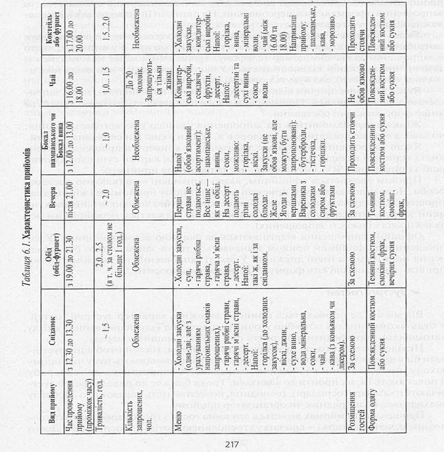 Найпоширенішою формою ділового протоколу є прийоми, основи організації яких необхідно знати як бізнесменам, підприємцям, так і менеджерам будь-якого рівня. Прийоми — це зібрання запрошених осіб, де гостям пропонують різні страви і створюють умови для спілкування і знайомства, відпочинку, ритуальних процесій і церемоній. Прийоми влаштовуються у зв'язку із завершенням якої-небудь видатної події, на національні свята, релігійні та професійні святкування, ювілейні дати, проведення важливих заходів. Слайд 2. Важливо зазначити, що основним сенсом прийомів є не споживання їжі та дегустація напоїв, а встановлення та поліпшення ділових й дружніх взаємин їх учасників. Йдучи на прийом, треба бути не тільки відповідно вдягнутими, але й підготовленими до відповідей на запитання та ведення світської бесіди. Слайд 3. Залежно від часу, на який вони призначені, звані прийоми поділяються на два типи - денні та вечірні, а також з розсаджуванням за столом чи без. До денних прийомів відносяться: «Келих вина», «Келих шампанського» та «Сніданок». Слайд 4. Основними видами вечірніх прийомів є «Обід» («Dinner»), «Обід-буфет»(«BьffetDinner»), «Вечеря» («Supper»), прийоми типу а-ля фуршет, коктейль, а також маленькі прийоми – кавовий або чайний стіл. До прийомів з розсаджуванням за столом відносять «Сніданок», «Обід» та «Вечерю». Слайд 5. «Келих шампанського» та «Келих вина» починаються о 12-ій годині та закінчуються о 13-ій. Під час такого прийому подають лише шампанське, вина та соки. На закуску подають маленькі тістечка, бутерброди, горіхи. Цей вид прийому зручний тим, що займає небагато часу і не потребує багато уваги. Прийом відбувається стоячи. Форма одягу - повсякденний костюм чи сукня. Відповідно до міжнародної етики, найбільш почесними за своїм характером видами прийомів є «Сніданок» та «Обід». Слайд 6. «Сніданок» влаштовується між 12 та 15 годинами. Подають до сніданку одну-дві холодні страви, одну рибну чи м'ясну, десерт. Коли гості зібралися, їм пропонують аперитив. По завершенні сніданку подають чай, каву, пропонують коньяк та лікери. Слайд 7. Форма одягу - повсякденний костюм чи сукня, якщо інше не зазначене в запрошенні. Слайд 8. «Коктейль» розпочинається між 17 та 18 годинами, триває не більше 2 годин, відбувається стоячи. На запрошенні вказується час початку та закінчення прийому (17.00-19.00, 18.00-19.00). Гості можуть приходити чи йти додому в будь-який час за вказані години. Нормальним вважається бути на прийомі приблизно 1,5 години. Надмірним порушенням етикету вважається прибуття на прийом співробітників фірми пізніше за своє керівництво. Залишають прийом, навпаки, першими керівники фірм чи підприємств, за ними (за старшинством) – інші співробітники. Господар та господиня в продовж всього часу прийому стоять біля входу, зустрічають та проводжають гостей. Слайд 9. Коктейльний стіл від інших видів столів відрізняється тим, що на ньому немає а ні тарілок, а ні виделок, є тільки дерев'яні чи пластмасові палички. В залі біля стінок та по кутках ставлять невеличкі столики, на які кладуть сигарети, ставлять попільнички та вазочки з паперовими серветками. Прикрашають столики квіти у невеличких вазах. Слайд 10. «Фуршет» проводиться з 17 до 20 години. Фуршетні столи накривають банкетними скатертинами так, щоб краї з усіх боків столу звисали однаково, на відстані 5-10 см від підлоги. Слай