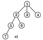 а) б) Мал.1 Почнемо пошук шуканої вершини 7 із заданої вершини 1 і зафіксуємо для себе цю інформацію, будуючи дерево пошуку, в якому на першому кроці нашого пошукового алгоритму є лише одна вершина 1 (мал. 22, а) та послідовність вершин, які перегля-даються (мал. 22, б). Встановимо покажчики перегляду вершин у послідовності так: верхній вказуватиме на номер вершини, з якої ми дивимося, а нижній - на номер останньої «видимої» вершини. Відповідно на першому кроці такою вершиною є єдина вершина 1. І ще одна інформація, яка може бути нам надалі корисною. Якщо забігти наперед і розглянути заданий граф (мал. 21, а), то можна помітити, що вершину з номером 1 знову побачимо, коли перейдемо до перегляду вершин 2, 3 та 4. Але повертатися у неї немає сенсу, оскільки при цьому ми «зациклимося» і бу-демо крутитися на одному і тому самому місці. Тому варто за-пам'ятовувати номери вершин, у яких ми вже побували, для того, щоб виключити їх надалі з перегляду. Яким чином мож-на реалізувати такий захист? Можна запропонувати два спосо-би: перший - проглядати послідовність переглянутих вершин (мал. 22, б), другий - використати множину для їх фіксації (мал. 2, в). Який з них ефективніший? Якщо кількість вершин невелика, то раціональніше скористатися множиною, як-що ж вона більша за 256 - то переглядом послідовності. Але у цьому разі інформацію про заданий граф необхідно представля-ти у вигляді списку суміжних вершин.
