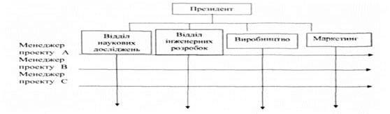 o Аспектам проекту, не зв'язаним 6езпосередньо з конкретною функціональною зоною, приділяється недостатня увага. o Мотивація командної роботи часто дуже слаба. o Потреби клієнта носять повторний характер, і реакція на них сповільнена 1521. Функціональна структура допускає використання існуючої функціональної ієрархічної структури організації. Функціональна організаційна структура організації на практиці часто трансформується б більш адаптивні типи структур, що можуть бути легко модифіковані відповідно до змін навколишнього середовища і потреб самої організації. У великих організаціях, наприклад, часто застосовується ливізіональна форма організації менеджменту. Основними типами дивізіонального підходу до організації менеджменту є: * дивізіонально-регіональна структура; o дивізіонально-продуктова структура; o дивізіонально-технологічна структура. Використання дивізіональної структури менеджменту не рятує від необхідності спеціалізованої організації менеджменту програми, хоча і має визначенні особливості вирішення даного завдання, пов'язані зі спеціалізацією і відносною незалежністю дивізіонів. Необхідно зазначити, шо класична матрична організаційна форма характеризується тим, що в ній об'єднуються якості структур як відособленого, так і функціонального проектів. В кожному такому проекті задіяні люди з різних функціональних зон. Менеджер проекту (Project Manager - РМ) приймає рішення щодо того, які завдання і коли повинні виконуватися, а функціональні менеджери вирішують, які саме люди будуть займатися цією роботою і які технологічні прийоми слід застосовувати.