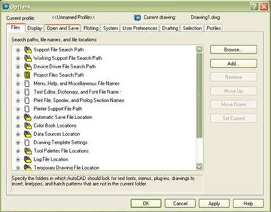 1.4. Настроювання робочого простору AutoCAD. У програмі AutoCAD реалізована можливість настроювання і зміни параметрів робочого середовища під конкретного користувача або його вимоги в різні періоди роботи. Процес настроювання робочого простору здійснюється в діалоговому вікні Options (рис. 1.48): Tools > Options… Вікно Options можна відкрити зі стандартного контекстного меню за умови, що немає команд, що виконуються, або обраних об'єктів. Рис. 1.48 1.4.1. Визначення доступу до файлів підтримки На закладці Files вікна Options (рис. 1.48) задаються шляхи доступу до файлів підтримки, де зберігаються шрифти, шаблони, типи ліній, зразки штрихувань і т.д. Тут перелічуються всі шляхи доступу до папок, що повинні існувати в поточній структурі локального і мережного дисків. В області Search paths, file names, and file locations: утримуються тематичні заголовки шляхів доступу до файлів і папок підтримки: - Support File Search Path – шлях доступу до допоміжних файлів; - Working Support File Search Path – шлях пошуку робочих допоміжних файлів; - Device Driver File Search Path – шлях доступу до драйверів пристроїв; - Project Files Search Path – шлях доступу до файлів проектів; - Menu, Help, and Miscellaneous File Names – імена файлів довідкової системи та інш.; - Text Editor, Dictionary, and Font File Names – імена файлів текстового редактора, словника і шрифтів; - Print File, Spooler, and Prolog Section Names – імена файлу друкування, програми фонового друкування і розділу прологу; - Printer Support File Path – шлях до допоміжних файлів друкування; - Automatic Save File Location – паку для файлу автозбереження; - Color Book Locations – папки для альбомів кольорів; - Data Sources Locations – положення джерел даних; - Drawing Template Settings – параметри шаблонів; - Tool Palettes File Locations – папки з файлами інструментальних палітр; - Log File Location – розташування файлу журналу; - Temporary Drawing File Location – папка для тимчасових файлів; - Temporary External Reference File Location – папка для тимчасових файлів зовнішніх посилань; - Texture Maps Search Path – папка для пошуку текстур; - i-drop Associated File Location – папка для зв'язаних файлів точок завантаження.