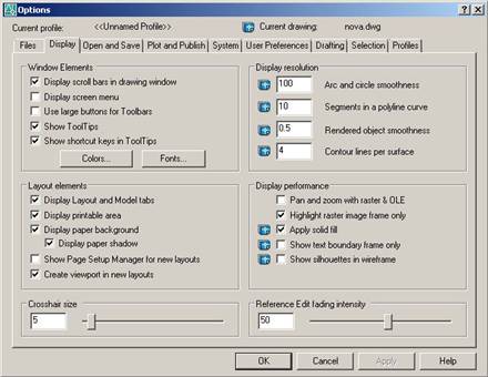 Рис. 1.49 Область Window Elements: · Display scroll bars in drawing window – включаються/відключаються смуги прокручування; · Display screen menu – включається/відключається екранне меню. · Use large buttons for Toolbars – змінюється розмір піктограм інструментів з 16?15 на 24?22 пікселей; · Show ToolTips – включаються/відключаються спливаючі підказки біля піктограм інструментів; · Show shortcut keys in ToolTips – додавання в підказках біля піктограм комбінацій клавіш; · кнопка Colors – при натисканні з'являється діалогове вікно Drawing Window Colors, у якому можна задати кольори для фона графічної області, текстового вікна, графічного курсору, тексту в графічній області й інших елементах програми; · кнопка Fonts – викликає діалогове вікно Command Line Window Font, що дозволяє змінювати шрифти, використовувані в текстовому вікні. В області Layout elements призначаються параметри креслення: · Display Layout and Model tabs – відображення закладок Layout і Model; · Display printable area – відображення границь друкування; · Display paper background – відображення фона; · Display paper shadow – відображення тіні біля границь; · Show Page Setup Manager for new layouts – запуск Диспетчера параметрів при відкритті нових аркушів; · Create viewport in new layouts – створення видових екранів при відкритті нових аркушів. В області Crosshair size встановлюється розмір перехрестя у відсотках від розміру екрана. В області Display resolution встановлюються: · Arc and circle smoothness – плавність відображення дуг і окружностей; · Segments in a polyline curve – кількість сегментів у дугах поліліній; · Rendered object smoothness – плавність відображення затонованих об'єктів; · Contour lines per surface – кількість утворюючих в поверхнях. В області Display performance набудовуються параметри відображення об'єктів: · Pan and zoom with raster & OLE – динамічне відображення в реальному часі растрових зображень; · Highlight raster image frame only – керує підсвічуванням растрових зображень при їх виборі (при установці прапорця підсвічуються тільки границі растра); · Apply solid fill – зафарбування плоских фігур і поліліній ненульової ширини (заливання показується при установці прапорця); · Show text boundary frame only – керування відображенням тексту (при установці прапорця підсвічуються тільки контури тексту); · Draw true silhouettes for solids and surfaces – відображення контуру тривимірного об'єкта (при установці прапорця показуються крайки силуета). Область Reference edit fading intensity – регулювання інтенсивності загасання підказок.