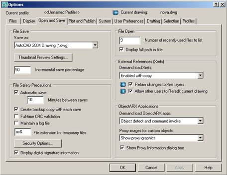 Рис. 1.50 В області File Open визначається кількість останніх файлів, що вказуються в падаючому меню, – Number of recently-used files to list і призначаються повні шляхи в заголовках – Display full path in title. В області External References (Xrefs) визначаються такі параметри: · Demand load Xrefs – підвантаження файлів зовнішніх посилань; · Retain changes to X ref layers – збереження зміни шарів посилань; · Allow other users to Refedit current drawing – дозвіл редагування малюнка як посилання. В області ObjectARX Applications визначається: · Demand Load ObjectARX apps – список підвантаженням додатків у наступних режимах: відключення завантаження по запиту, виявлення сторонніх об'єктів, виклик команди або виявлення об'єктів і виклик команди; · Proxy images for custom objects – список заступників для сторонніх об'єктів: призначається, показувати елементи, не показувати їх або показувати тільки рамку; · Show Proxy information dialog box – висновок вікна зведень про заступників.