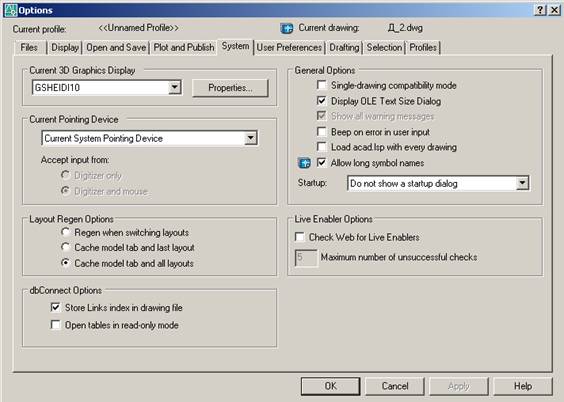 3D Perfomance - визначення системи тривимірної графіки: · стан видів при маніпуляції – для підтримки прийнятної швидкості встановлюється знижений режим; · динамічна апроксимація при промальовуванні поверхонь і кривих; · параметри рендеринга – з фоновими зображеннями, джерелами світла, матеріалами, а також з текстурами; · програмне або апаратне прискорення. Current Pointing Device – вибір поточного пристрою вказівки (миша). В області Layout Regen Options набудовується регенерація вкладок: · Regen when switching layouts – регенерація при переключенні; · Cache model tab and last layout – кеширування моделі й останнього листа; · Cache model tab and all layouts – кеширування моделі і всіх аркушів. Параметри підключення до баз даних встановлюються в області dbConnect Options: · Store Links index in drawing file – забезпечує збереження індексу зв'язків у малюнку; · Open tables in read-only mode – забезпечує відкриття таблиць тільки для читання. В області General Options призначаються загальні параметри: · Single-drawing compatibility mode – багато- або однодокументний режими; · Display OLE Text Size Dialog – вивод вікна властивостей OLE-об'єктів; · Show all warning messages – відображення попереджуючих повідомлень; · Віяло on error in user input – включення звуковий сигнал оповіщення про помилки користувальницького введення; · Load acad.lsp with every drawing – завантаження файлу acad.lsp з кожним малюнком; · Allow long symbol names – дозвіл на використання довгих імен; · у списку Startup дозволяється або забороняється висновок діалогового вікна початку роботи. Область Live Enabler Options: · Check Wed for Live Enablers – пошук адаптерів об'єктів в Інтернету; · Maximum number of unsuccessful checks – визначається максимальна кількість негативних перевірок.