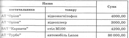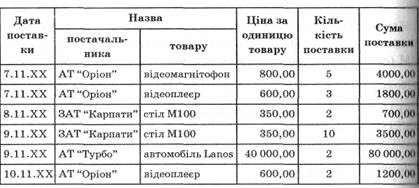 SELECT назва постачальника, назва товару, SUM (Сума поставки) FROM ПОСТАЧАЛЬНИКИ GROUP BY назва постачальника, назва товару HAVING назва постачальника <> "ЗАТ Карпати" AND SUM (сума поставки) > 3000,00 Результат запиту буде таким: