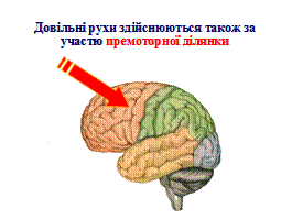 Довільні рухи – це свідомі рухові реакції, для здійснення яких обов’язкова участь кори головного мозку. Рухові центри кори головного мозку розташовані переважно попереду центральної борозни, тобто в лобовій частці мозку: - в передцентральній звивині - в парацентральній часточці - в прилеглих ділянках лобової частки