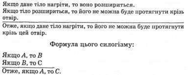 За допомогою символів математичної логіки суто умовний силогізм можна записати так: (Л->В)л(В->С)->(A->С). Суто умовний силогізм відображає такі причинно-наслідкові зв'язки трьох явищ, коли одне явище є причиною другого, а це друге виступає водночас причиною третього явища. Випадки зв'язку, які мільярди разів повторюються на практиці, таких трьох явищ приводять нашу свідомість до переконання, що можна логічним шляхом установити відношення між першим (А) і третім (С) явищами на основі другого (В), безпосередньо пов'язаного з ними причинно-наслідковим зв'язком. Це переконання нашої свідомості закріпилося у практиці мислення у формі суто умовного силогізму. Як видно із формули і наведеного прикладу, в цих умовиводах умовними є не тільки засновки, а й висновок. У більшому засновку висловлюється основа і наслідок, що з неї випливає: якщо А, то В. У меншому засновку йдеться про те, що якщо існує наслідок більшого засновку, то з нього, як із основи, в свою чергу, випливає певний наслідок: якщо В, то С. У висновку встановлюється відношення, існуюче між основою більшого і наслідком меншого засновку, тобто між основою і наслідком результату: якщо А, то С. Пов'язуючою ланкою між засновками виступає наслідок (В) першого і основа (В) другого засновку. Вона виконує роль середнього терміна і до висновку не входить. Висновок чисто умовного силогізму ґрунтується на такій аксіомі: результат наслідку є наслідок основи. Суто умовний силогізм дає змогу від одного факту або явища перейти до другого, причинно пов'язаного з першим, а від другого — до третього і таким чином установити не дану безпосередню умовну залежність третього факту або явища від першого, вихідного явища. Ця особливість суто умовних умовиводів широко використовується у слідчій практиці для виявлення, аналізу і оцінки доказових фактів та джерел доказів. Справді, якщо факти, ознаки, обставини причинно пов'язані між собою, то з визнанням одного факту ми маємо визнати існування (або неіснування) другого факту, а з наявністю (або відсутністю) третього факту і т. д. За вихідне (причину, основу) береться якийсь факт, повідомлений свідком, потерпілим, обвинувачуваним, експертом, або факт, установлений слідством, і з нього за формою суто умовного силогізму виводять інші факти. Умовивід має такий вигляд: