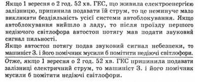 Наприклад, за кримінальною справою про аварію поїзда слідчий від відомого факту (1 вересня о 2 год. 52 хв. ГЕС припинила подавати струм залізниці) дійшов висновку, що свідчення машиніста 3. і його помічника, нібито вони не проїздили сигналів заборони (жовтого кольору світлофорів), не відповідають тому, що було насправді. Умовивід будувався так: