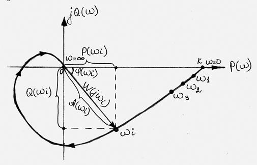 АЧХ показує, як елемент пропускає сигнали різної частоти. Оцінка пропускання проводиться по відношенню амплітуд ym/xm. ФЧХ показує, яке відставання або випередження вихідного сигналу по фазі створює елемент на різних частотах. Амплітудну і фазову частотну характеристику можна об'єднати в одну загальну - амплитудно-фазову частотну характеристику (АФЧХ або АФХ). АФЧХ W( jw) є функцією комплексної змінної jw, модуль якої дорівнює A(w), а аргумент рівний j(w). Кожному фіксованому значенню частоти w i відповідає комплексне число W(jwi), яке на комплексній площині можна зобразити вектором, що має довжину А(wi) і кут повороту j(w i). При зміні частоти від нуля до нескінченості вектор W(jw) повертається навколо початку координат, при цьому одночасно збільшується або зменшується довжина вектора. Кожній точці характеристики відповідає певне значення частоти. Проекції вектора W(jw) на дійсну і уявну осі називають відповідно дійсною P(w) і уявною Q(w) частотними характеристиками.
