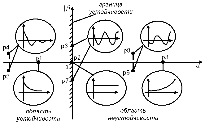 Функція yc(t) є синусоїдою з частотою bk і амплітудою, що змінюється в часі як експонента. - ak < 0 (корінь p5 та p4) – коливальна складова затухатиме. - ak > 0 (корінь p8 та p9) – амплітуда коливань необмежено зростає. - ak = 0 (корінь p6 та p7) – обидва корені уявні: pk = +jbk и pk+1 = -jbk, то yc(t) є незгасаючою синусоїдою з частотою bk . На підставі проведеного аналізу коренів характеристичного рівняння можна сформулювати загальну умову стійкості: - для стійкості лінійної САК необхідне і достатньо, щоб дійсні частини усіх коренів характеристичного рівняння системи були негативними. - для стійкості лінійної системи необхідно і достатньо, щоб всі корені характеристичного рівняння знаходилися в лівій півплощині комплексної площини коренів. Наявність хоч би одного правого кореня робить систему нестійкою. Стійкість системи залежить тільки від виду кореня характеристичного рівняння і не залежить від характеру зовнішніх впливів на систему. Стійкість є внутрішня властивість системи, що властива їй незалежно від зовнішніх умов. Уявна вісь jb є межею стійкості в площині коренів. Якщо характеристичне рівняння має одну пару чисто уявних коренів (pk = +jbk и pk+1 = -jbk), а решта усіх коренів знаходиться в лівій напівплощині, то в системі встановлюються незгасаючі гармонійні коливання з круговою частотою w = | bк |. Це коливальна межа стійкості. Точка b = 0 на уявній осі відповідає нульовому кореню. Якщо рівняння має один нульовий корінь, то система знаходиться на аперіодичній межі стійкості. Якщо таких кореня два, то система нестійка.